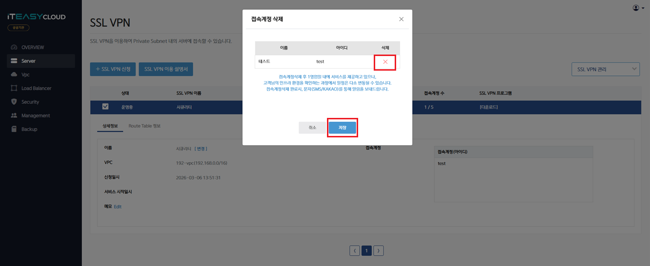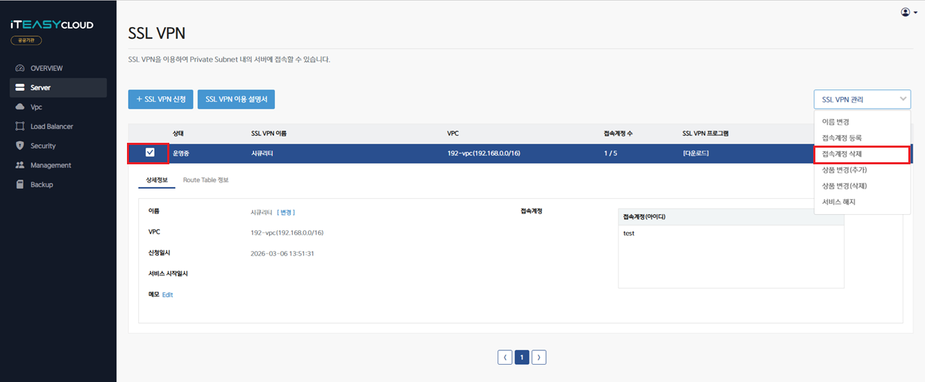 b) 삭제할 계정이 존재하는 SSL VPN 을 선택하시고, 서비스 관리 메뉴에서 '접속계정 삭제' 를 선택합니다.